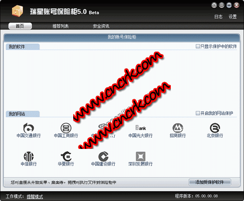 瑞星账号保险柜5.0是一款免费的网民个人信息和网络财产安全保护工具。专门针对木马病毒、黑客入侵和钓鱼网站等互联网威胁,有效保护网上银行、股票交易软件、网游、即时通讯软件的账号密码安全。