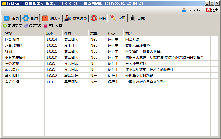 WeLite采用插件扩展架构,可以很好的支持各种应用的扩展,如签到、查天气、查快递、查车票或者玩游戏,也可以用来当作好友清理、群管理、信息记录等的工具。插件开发者可以在本软件基础上任意扩展所需要的功能,让您的开发随心所欲。微信机器人基于最核心的云端技术融入微信机器人系统,更稳定、更快速,启用全新界面引擎,加载最先进的功能模块,带来崭新体验,更加流畅轻快,遵循最新的腾讯微信协议规则,让每一个用户使用更放心,群管娱乐更方便,免去数据库安装步骤,直接运行微信机器人程序,用户数据等一目了然。