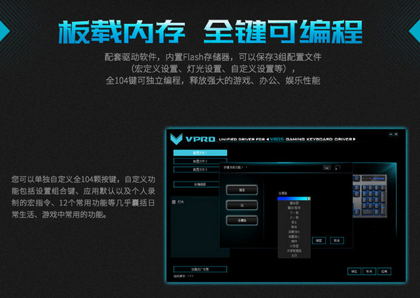 1、魅惑蓝·单色背光系统回归纯真的单色背光,Fn+Pause切换普通模式和驱动模式。在普通模式下,您可以通过Fn组合键切换12种灯光模式;在驱动模式下,通过驱动软件,切换多达16种灯光模式,并支持单键独立设置灯光亮/灭,自定义个性化灯光。