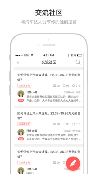 3. 交流社区 - 在这里,有专业的汽车顾问,帮你解答你对汽车相关的一切疑问。当然,你也可以把你所知道的知识告诉给所有人。