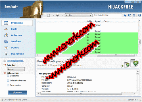 Emsisoft HiJackFree能够浏览和设置所有的自动运行程序,显示超过50种不同位置的自动运行程序和当前用户或所有用户默认的注册表启动程序。