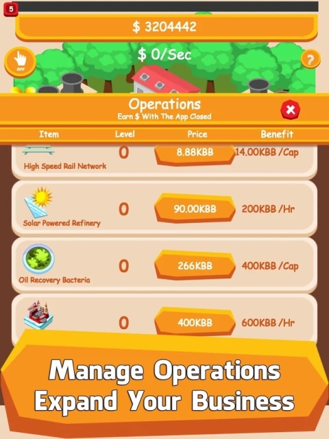 在后院里,你发现一个油田,你必须要发展、购买新设备、建造、聘请安保、交易石油、购买新的油田…在5大环境创建你的油田市场,泵出一个新帝国。【石油大亨破解版说明】