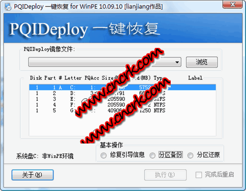 PQIDeploy 一键恢复是基于Symantec PQIDeploy (ImageCenter, Drive Image Pro)的免费系统备份与还原工具,适用于Windows NT/2000/XP/PE。对当前系统盘的操作,应到WinPE下运行。