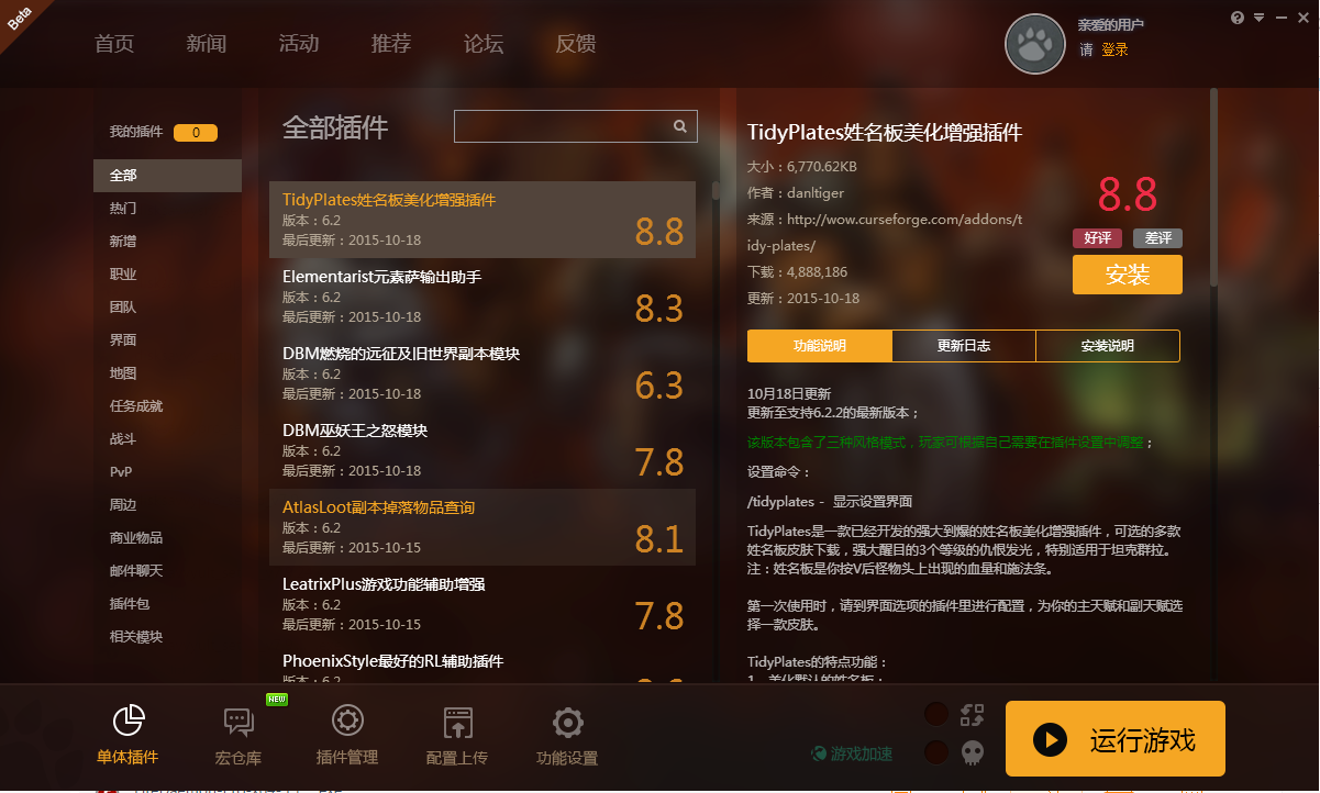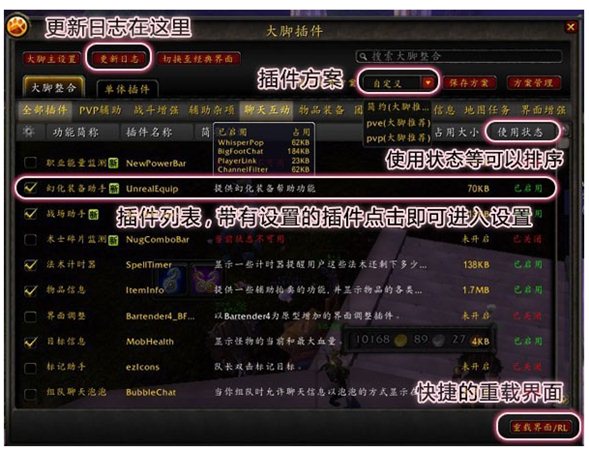 界面增强功能分类目录中,有动作条增强、聊天增强、大脚头像、技能计时器、目标信息、界面调整、技能触发、冷却监控、鼠标提示、头像增强、增益法术和装备信息功能供玩家选择。玩家通过设置这些插件可以在游戏中实现头像功能增强、增加额外的动作条、设置鼠标提示内容、(DE)BUFF时间显示增强、系统默认面板移动等UI设置与界面增强功能。