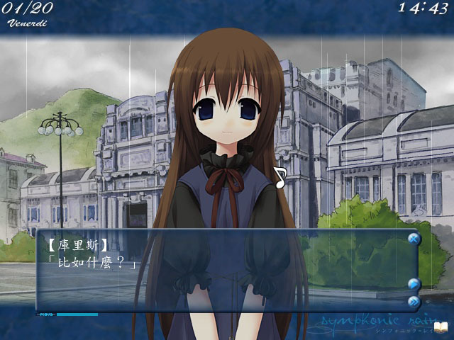 《交响乐之雨(Symphonic Rain)》是一款日式视觉小说游戏,由KOGADO STUDIO制作,Degica发行。主角库里斯(玩家)的一天开始于住宿公寓里的早晨,梳洗之后他会到琵欧伯音乐学院上学。只要完成了早上老师的教授课程,下午之后就可以在学院里自由走动,除了可以到练习室练习钢琴的弹奏技巧之外,还可以随意四处走动,借机寻找合唱的搭档人选,随着场景的移动会有不同的剧情衍生而出。