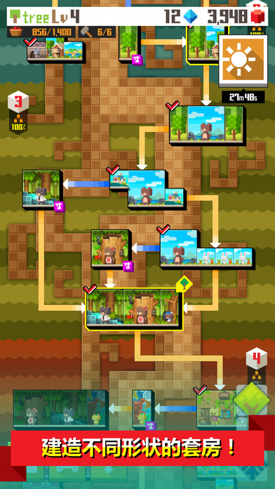 摇晃树收集水果和金钱。从树根地图找到隐藏图纸为居民们修建更多住所。