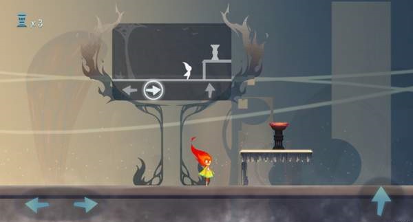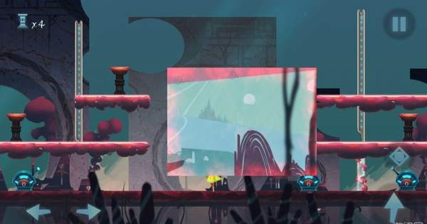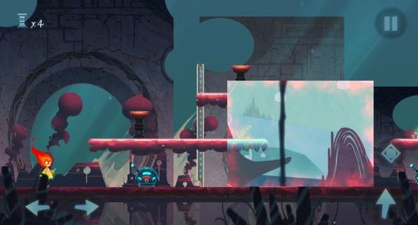 值得注意的是,这种回溯能力所产生的区域只有一个地图的四分之一大小,想要让这个区域进行移动则需要玩家用手指将其拖动,这种设定让游戏的解谜难度增加了不止一点点。比如说现在几个完全浮空的台阶,用正常的跳跃妥妥的跳不上去了,这时候你就要将回溯拖动到适合的位置,一个存在于过去的台阶就出现了,这时候你跳上去,然后将回溯区域拖动到其他点,请注意,这时你站的台阶是存在与‘过去’的,一旦这个区域脱离了你所在的位置,你就会回到‘现在’,也就会掉下来…很简单的设定,但这却位解谜提供了不小的困难,游戏所站的位置,对于地图的记忆都需要极为精准,错了一点都有可能前功尽弃。而这其实也是游戏的一个BUG所在,由于回溯区域是完全由玩家所控制的,这难免会于地形的判定区产生重叠,所以经常会出现明明主角跳到了台子上但掉了下来。为啥我的主角只剩下一条腿等情况……