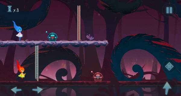 当玩家都习惯了回溯玩法之后,觉得没有什么挑战性了,这时候《点燃火炬》这款作品就会带来下一个解谜要素,那就是双人模式。这个双人模式不是什么需要两个人同时操作的东西,而是需要玩家用一套按键同时操作两个角色。进入到双人关卡之后玩家就能发现除了红色的主角之外,屏幕上会多出来一个蓝色的主角(感觉真的像森林冰火人)而她就是需要操纵的另一个人物了,一般来讲,这个蓝色的小人会站在与主角有一定距离的地方,有些机关需要用她才能够解锁,这些谜题大多都会比较复杂且没有可逆性,这是什么意思呢?就是说如果一个不小心,两个主角凑在了一起,然后就GG只能重来了。亦或者某些关卡因为一些独特的操作导致两个小人都困到一块了,也会导致GG。由于关卡设定的原因,部分地图都是需要两个角色合作才能解开的,这就是导致游戏失败的原因,当然在单人关卡是没有这种设计存在。还有一点需要注意的是,蓝色的小人她的操作可能是与红色小人的操作方式截然相反,比如红色往左走蓝色往右走,这种情况在部分关卡也可能出现,这让游戏的难度也提升了不少。