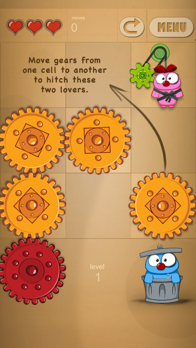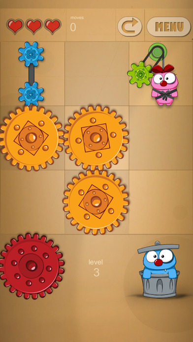 齿轮在一起(齿轮爱挑战)是一款益智类休闲游戏.在游戏中50多种不同难度的关,越往后就越困难,你所需要做的就是利用其中的齿轮,将怪物妈妈送到怪物爸爸的手上.