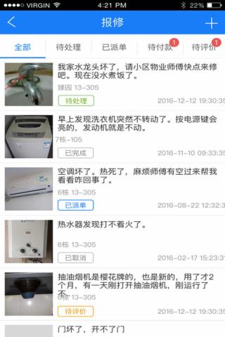 【物业报修】业主和家庭成员以及租客,均可通过手机APP对自家或公共区域出现的故障向物业进行反馈,物业可以通过后台查看所有的报修记录,并安排相关人员进行处理,用户报修时,可以通过拍照以及文字描述的方式进行精确的反馈。