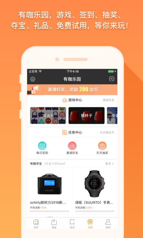 3、有咖乐园汇聚了游戏、签到、抽奖、夺宝、礼品、试用等