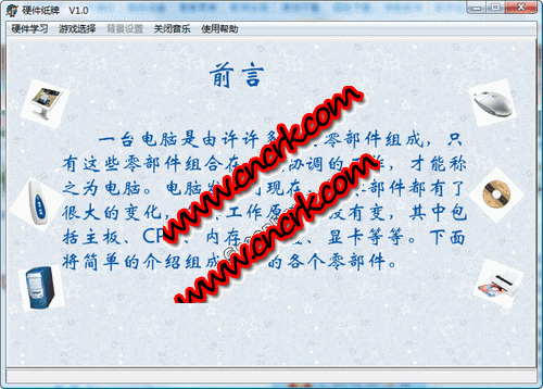 本课件围绕人教版高中《信息技术》第一册的“微型计算机简介”而设计,主要目的是让学生了解并逐步熟悉计算机的硬件组成。本课件将教学内容巧妙地加入到纸牌游戏中,寓教于乐,在游戏的氛围中,使学生不知不觉地熟悉计算机硬件的组成
