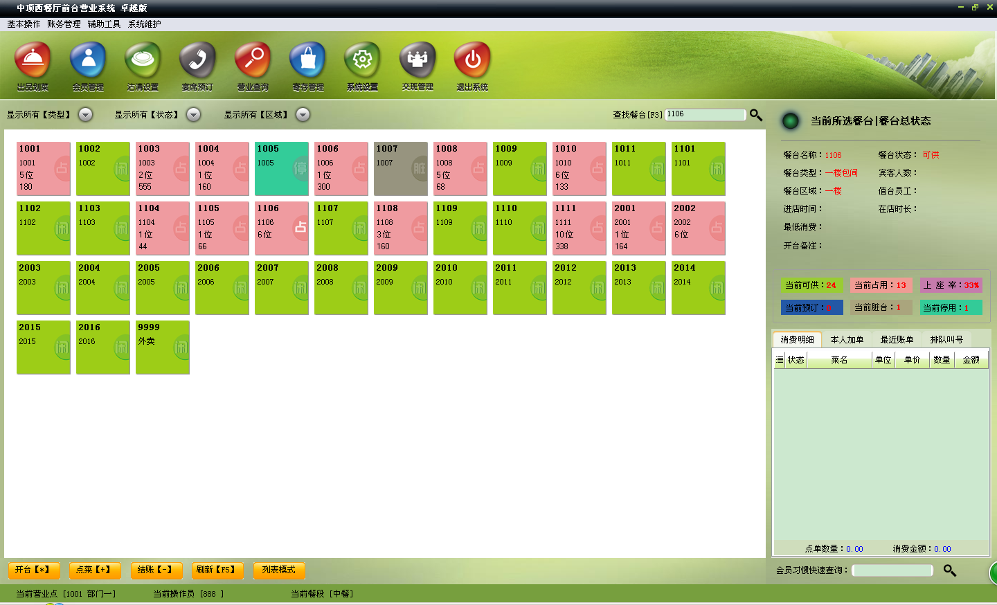 前台点菜收银1、宾客进店开台:选中可供餐台 -> 单击开台 -> 输入人数、服务员信息 -> 点击【开台】按钮完成开台操作。