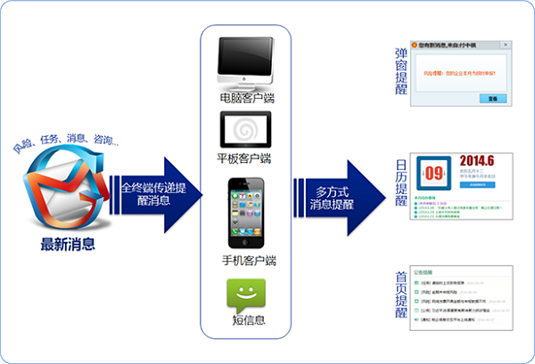 提供便捷、多渠道的即时消息提醒服务,自动实时将与用户相关的涉税风险、涉税任务、申报期限、通知公告、涉税政策等信息到达、快到处理期限进行电脑弹窗、手机通知中心、平板消息中心、办税日历、短信息等多方式提醒。 对用户而言,消息提醒多渠道、多方式的传递,用户不用担心错过任何重要消息,实现由“人找人”向“信息找人”的转变!
