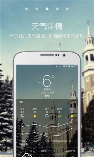 -精湛的画面设计和精美的风景照,尽显你所在之处、四时变化和当前天气状况的特性;-详尽的天气信息,包括 10 日的天气预报和24小时的温度预报;