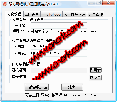 琴岛网吧维护通道程序 V1.4.1 简体中文绿色免费版 琴岛网吧维护通道程序服务端运行于服务器上,根据自己的情况进行设置,服务端带有自动绑定客户端的路由IP和mac地址、自动更换桌面壁纸、自动更新琴岛Killdog高危病毒免疫程序、自动更新客户机Hosts、开机启动各种程序并可以设置延时执行,无需开启共享,运行稳定安全可靠!360认证书 http://renzheng.360.cn/zhengshu.htm?id=53(可能部分杀毒误报,请用户注意判断.)