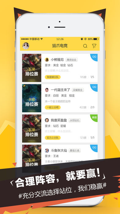 猫爪电竞是国内首创专业的电竞服务平台,以房间的组队形式,让电竞玩家可以通过平台,有机会找到更合适、更专业队友。同时,猫爪电竞还汇集了国内顶尖高手加入,通过强带新,新变强,强再带新的良性循环,提高国内玩家的电子竞技水平。【功能介绍】
