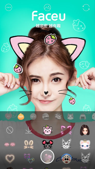 【动态贴纸】猫须、腮红、兔耳朵动起来,动次打次普通的摇~。人脸识别贴纸自动跑到你脸上,瞬间让你萌萌哒【美颜滤镜】恭喜你已经发现了一款自拍神器,超自然的美颜效果,不自拍也要拿来当镜子照,好想活在Faceu里,嘤嘤嘤~
