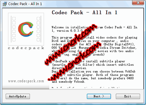 Codec Pack All In V1 6.0.3.0 英文官方安装版 Codec Pack All In 1 是一款非常好的免费多媒体文件解码工具包,集最优秀的解码器于一身,是播放Divx的必备工具!包括DivX 解码器;XviD (Koepi”s binaries) 解码器;DivX、XviD - FFDShow 解码器;g400 解码器;DVobSub 解码器;OGG Vorbis 解码器;AC3 解码器;Morgan Multimedia Stream Switcher 解码器。
