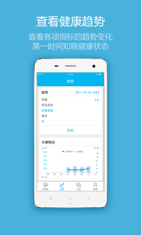 【记录板】根据您的健康状况,智能的推荐您每天的记录项。帮助您每天更便捷地记录各项生理饮食指标。医生可以时时观测您身体状态的变化,以此来帮助您更好的管理健康。目前,软件支持记录心率、呼吸频率、咳嗽和皮疹等多个记录项。【趋势】应用系统可智能的对您录入的数据进行分析,让您清楚地知晓身体的变化。方便医生检查您的记录指标,以此做出更准确的指导和建议。