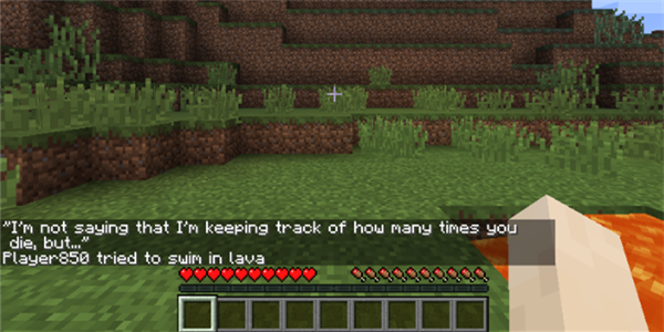 当玩家死亡时,游戏会向所有玩家宣布你的死亡,以及诸如“在熔岩中游泳”这样的条件。这个mod在这个消息的上面添加了一个有趣的有趣的引用。When a player dies the game announces to all players that you died and from what condition such as "swimming in lava". This mod adds a funny amusing quote just above that message.
