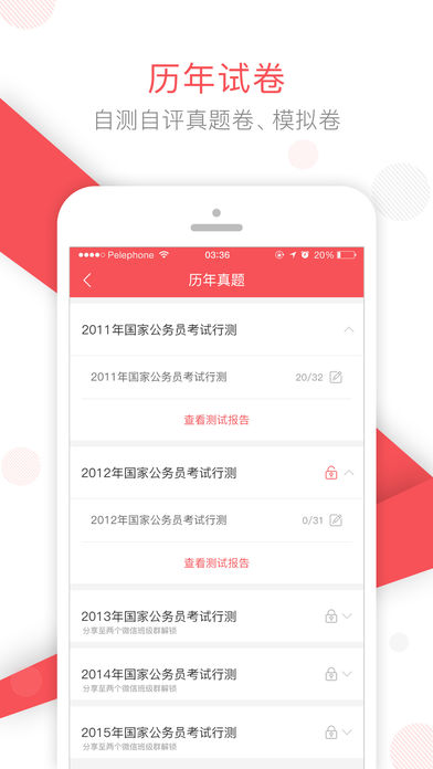 1 十年真题,五大专项:提供十余年国考和省考真题,答案解析均由两位授权名师共同编辑审核。覆盖五大专项,分类160个考点,每个考点专项练习,各个击破。2 个性出题,精准预测:根据目标考试的考点,考频,难度,用人工智能算法实现一对一智能出题;通过记录用户练习情况,生成能力评估报告,精准预测考分。