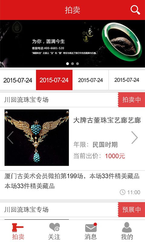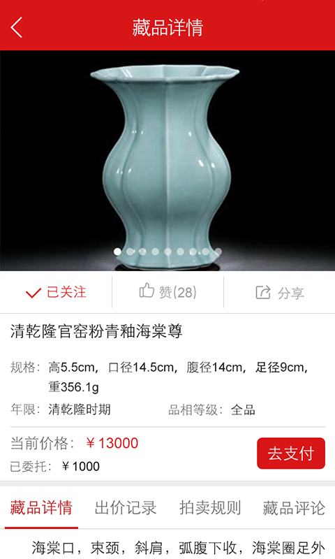 古美术APP专注于高端艺术品拍卖,向用户提供藏品预展出价和拍卖现场实时竞价功能,并提供加一手、委托出价等多种出价方式。预展期间可对心仪藏品进行关注或出价,系统将在开拍前提 醒用户参与现场竞拍。多种支付方式:微信、支付宝、银联,方便快捷;多样化的分享:支持微信、QQ、微博主流社区的分享功能,方便您第一时间与好友分享心爱的藏品。