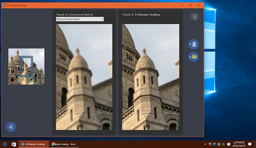 下载好软件后安装,打开软件,虽然是英文版但是不妨碍使用,启动后,把想要放大的照片、图片,直接拖曳到A Sharper Scaling视窗中,这时候右边会显示可以放大的倍率,最多可以放大到4 倍(400%)。进行照片放大后,A Sharper Scaling会显示出一个比较图,左方是一般软体放大后的效果,右方是A Sharper Scaling放大后的效果,如果你觉得满意,按下最右边的储存,就能另外储存成更大解析度的图片(因为照片放大了)。