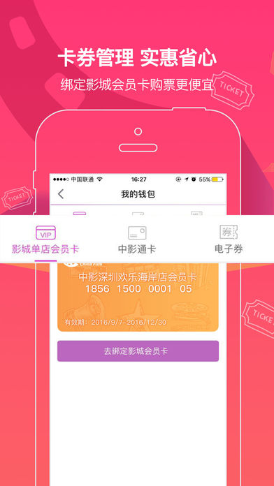 支持绑定影城会员卡和中影通卡,影城会员卡可线上充值;
