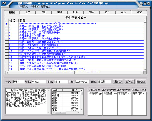 轻松学生评语系统非常适合班主任使用,轻松学生评语软件可自动生成学生评语,也可以自己添加评语,从而避免老师重复性操作,减少老师的工作量!【软件特点】