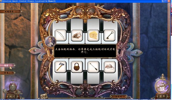这个游戏的场景里没有单词找物,有的是借鉴昔日回响系列里把物品放回原处的设计。相对来说它要容易得多,在可以放回原处的地方鼠标会变成一只手和齿轮的样子。把下方的物品放回原处,没有额外的单词,而且每个归还物品的场景都相当漂亮。《侦探任务:水晶鞋》还配有可以快速移动的地图,地图设计得非常美丽。室内和室外的场景区分很明显,若要查看室内的场景,点击建筑物就能放大看到室内的地图,颇有逃生地图的味道(安全出口在这里……)。图例标注得很清楚,需要做什么一目了然。整个地图可以说是主场景的一个缩影,仿真度极高。至于里面的谜题,那就非常简单了,第一个就是配对的,比如花和花瓶一对,钥匙和锁一对。小编玩过三个小游戏,都很轻松地过了。里面的魔法森林真是个仙境,美得让我都想去了。这么美丽的场景,让当年的觉醒2里的落月森林瞬间失去色彩。