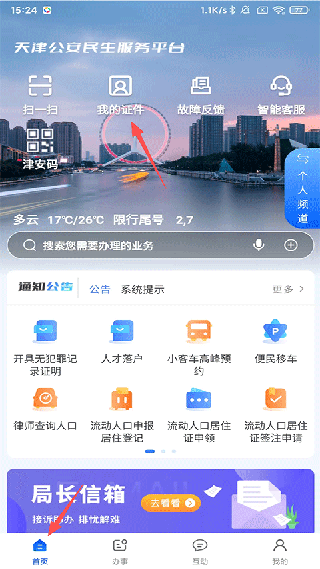 1. 开启天津公安民生服务平台App,于首页轻点【我的证件】。
