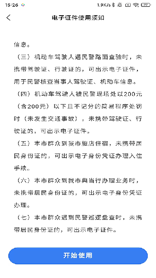 2. 先查阅电子证件使用须知,接着点击下方的【开始使用】按钮。