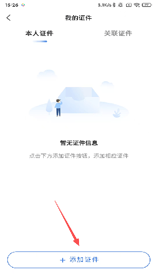 3. 于我的证件页面,点击下方的【添加证件】按钮。