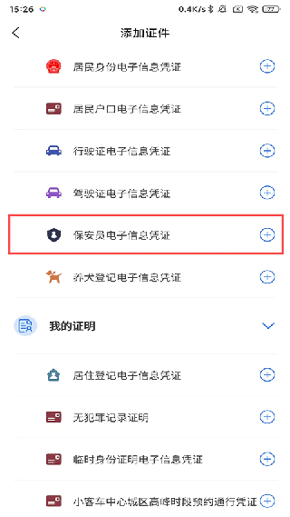 4. 查找保安员电子信息凭证,点击其右侧的【+】,便能查询已持有的保安证。