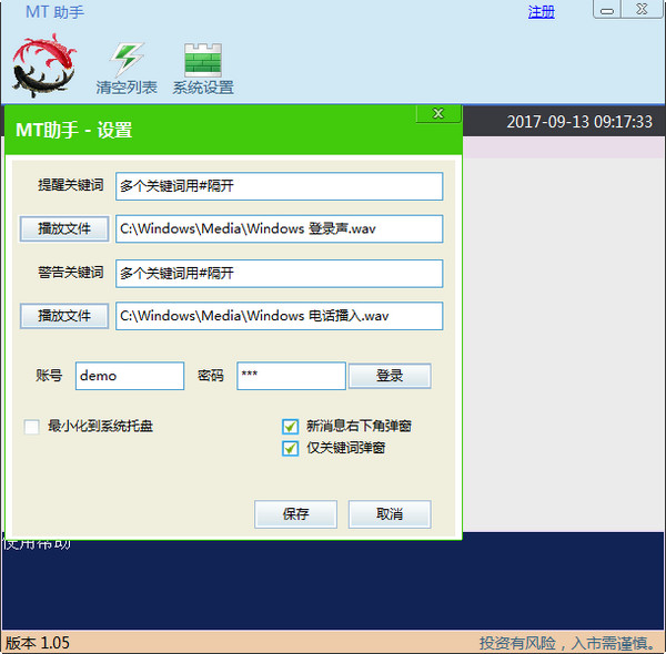 股票MT助手是一款小巧好用的股票MT4提醒软件。用户通过股票MT助手设置几个提醒的关键词,股票MT助手即会在第一时间获取该关键词的最新资讯推送给用户,以确保用户可以获取查看第一手资料。