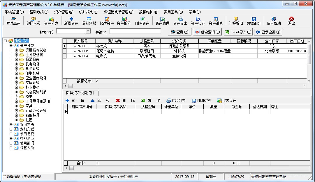 天皓固定资产管理系统是一款功能强大的固定资产管理软件。软件广泛适用于电子、电器、医药、服装、建筑、物资、化工、商贸、超市、旅游、机械、建材、科技、通讯等各类企业公司,及机关、事业单位、学校、研究所等机关事业型单位。可用于资产调配管理、财务统计分析等方面,对于加强固定资产管理,避免资产流失具有良好的辅助作用!软件容涵盖了资产增加、清理、借出、归还、维修、折旧及系统数据的查询、统计、报表、导出EXECL、数据导入、打印输出等,操作简便、功能卓越;并具有多用户权限管理、批量处理、自动核算折旧值、自定义各种报表;软件设置功能详细,可适合各种用户类型的操作习惯。