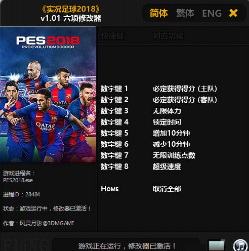 实况足球2018六项修改器,拥有无限体力、无限训练点数、锁定时间、超级速度、直接得分、增加10分钟、减少10分钟等功能,实况足球2018修改器v1.01由“风灵月影”制作,喜欢的玩家不要错过哦!【软件特点】
