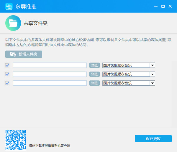 多屏推推电脑版是一款免费绿色的资源共享软件。该软件可支持视频、音频、图片以及其他类型的资源共享及播放,也可自行设定文件共享格式的限制,简单且实用。