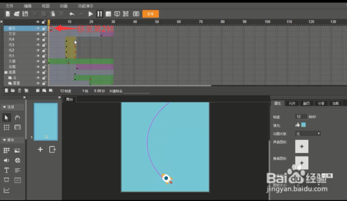 在图层第10帧的位置“插入关键帧动画”,设置火箭从底部弯曲滑向上端并放大的动画效果