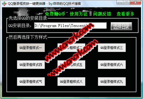 使用该工具可以轻松实现一键更换QQ登录框皮肤的目的,目前供有9中皮肤可以任你免费换,绿色工具无需安装,下载解压即可使用。没有任何插件,完全免费使用!