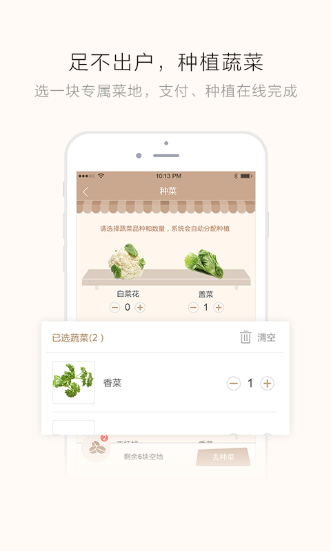 1、线上挑选菜地:登录APP,挑选心仪的菜地,完成付款,再为它起个名字,即可拥有一块专属菜地。
