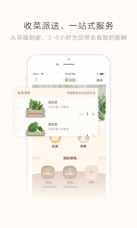 菜成熟后,系统会自动提醒,点击收菜,3-6小时即可派送上门。