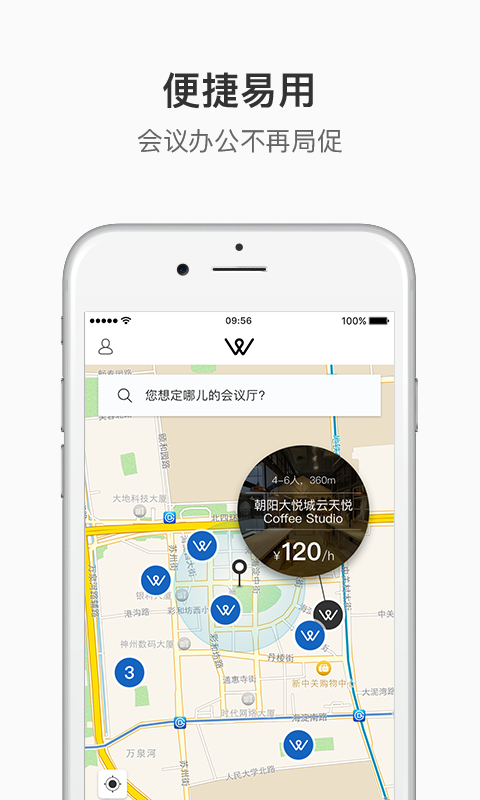我们在整座城市,为需要即时办公的你定制了上百个便捷、精致、智能化的专业会客厅。借助WStudio APP客户端,一键找到可用的共享空间,无障碍解锁,即订即享。