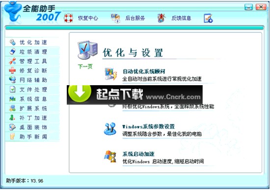 全能助手Windows优化王打破了传统优化软件的局限,以简化电脑操作为标准,以用户需求为基础,开创优化软件新时代。 软件提供了七大类功能:系统优化与系统设置、垃圾清理与数据备份、系统修复与上网修复、管理工具与系统维护、文件操作与文件处理、系统信息与硬件信息、办公辅助与迷你工具。其中典型功能主要有:系统优化、系统设置、系统垃圾清理、自动上网痕迹添理、IE修复、插件免疫、Mp3文件更名、端口诊断、系统修复等。软件以人为本,操作简便、占用空间小、执行速度快。是您装机必备的首选!做中国系统辅助工具的第一品牌。