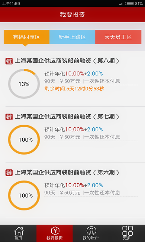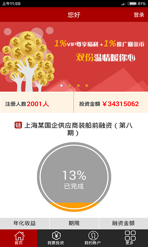 1、随时查看自己的账户信息2、进行投资操作,具有注册、投标、充值、提现、查询账户收益等全部功能,年化收益率高达12%,50元起即可投资。
