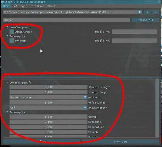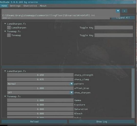 下拉并选择KF2.ini,LumaSharpen和Tonemap前面的方框可开启或关闭特效,窗口下方还可以设置参数进行微调