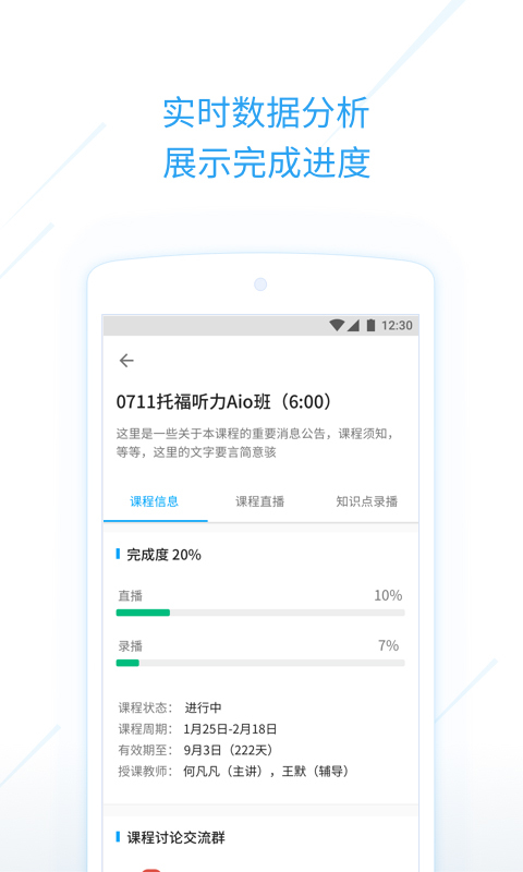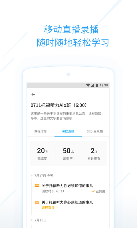 结合课程内容,移动展示课程直播和知识点录播,随时随地轻松上课。