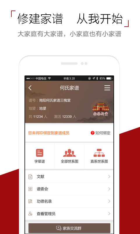 怀恩宗族家谱,是记载一个姓氏家族或家族某一分支的宗族氏系和历代祖先的名号谱籍。是中华民族独有的历史传承和文化积淀,是炎黄子孙根脉相连、生生不息的历史见证。宗族家谱,承载着义无反顾的家族凝聚力。相同的姓氏构成了家族,百家姓氏和千千万万个家族的汇聚,组成了中华民族的大家庭。族谱体现了宗法与人伦这一维系家庭、家族关系的本质功能,同时它也具有维系社会、法律、道德、传统的深厚内涵。【更新日志】