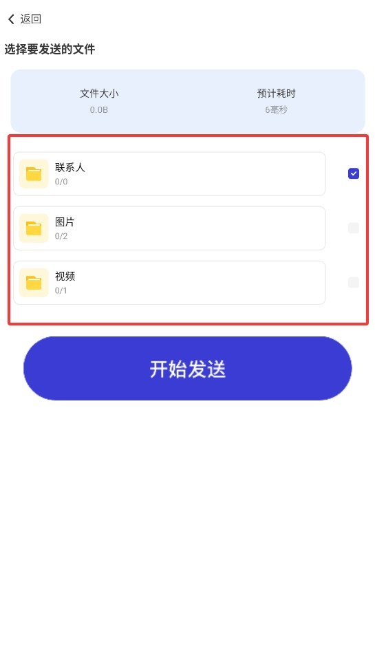 2、挑选出你打算传输的联系人,以及要发送的照片、视频,点击“开始发送”,耐心等待即可。